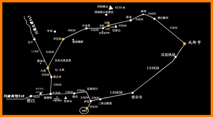 成都、雅安、二郎山隧道、磨西鎮(zhèn)、瀘定、康定、折多山、新都橋、高爾寺山、雅江、剪子灣山、理塘、毛埡大草原、兔子山、海子山自然保護區(qū)、稻城、亞丁、沖古乃寺、神山仙乃日、珍珠海、丹巴、八美、日隆、四姑娘山。